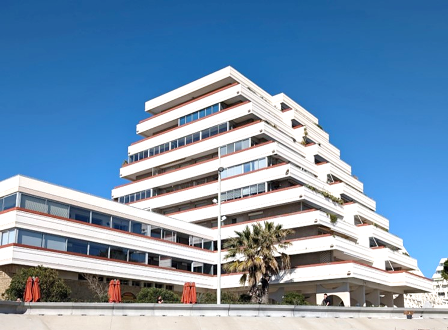 Notre balade se poursuit au Couchant, avec une rencontre avec le bâtiment emblématique « Le Poséidon ». Réalisé par Jean Balladur et son fils Gilles, il règne sur le Couchant.